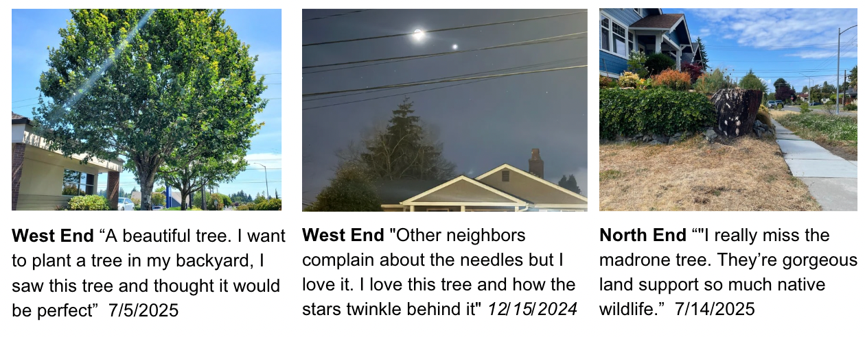 A major part of the project included submissions from you, the community! The prompt was simple: Send a photo of a tree on a street, or a street where you wish there was a tree. The photos submitted through the survey varied in location, detail, and description. However, descriptions often included personal stories and significance. If you want to submit a photo utilize the form here, or email treesoftacoma@gmail.com