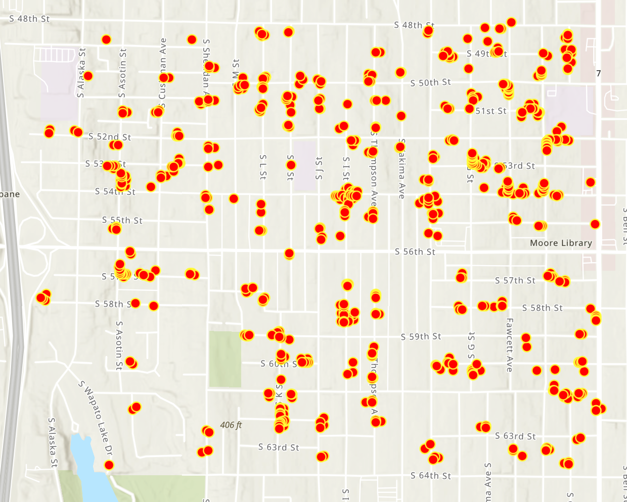 At the end of September, Natalie was out in the neighborhoods of South Tacoma marking potential planting sites for trees. Working in the heat of unshaded right-of-ways, she measured the space between utilities, sidewalk, and road to decide the right size and species of tree for each space. Although this is hard work, Natalie finds that it is "kind of tricky" but that it is fun, "fun like a puzzle."