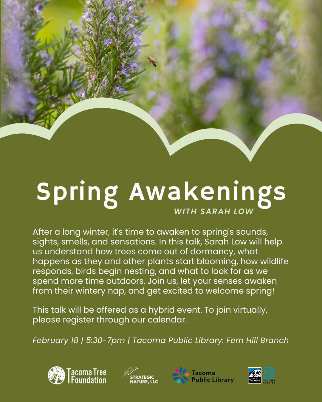 After a long winter, it's time to awaken to spring's sounds, sights, smells, and sensations. In this talk, Sarah Low will help us understand how trees come out of dormancy, what happens as they and other plants start blooming, how wildlife responds, birds begin nesting, and what to look for as we spend more time outdoors. Join us, let your senses awaken from their wintery nap, and get excited to welcome spring!
